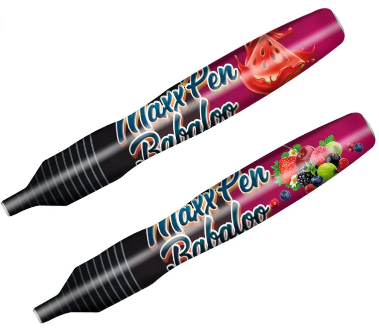 A Caneta Maxx Babaloo é formulada com açúcar invertido, glicerina, aroma idêntico ao natural e corantes alimentícios (Vermelho II e Vermelho 40).